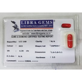 REPORT.NO. LCI 11CLARITY. N/ACOLOUR. REDSHAPE/CUT. CAPSULEWT. 6.28 CTSDIMENSION. 8.9-6.1-5.8R. INDEX. N/AHARDNESS. 3.5COMMENT. CORAL..