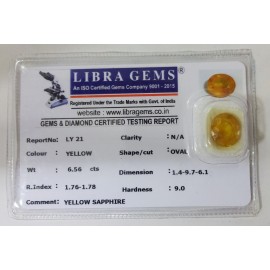 REPORT NO . LY 21CLARITY . N/ACOLOUR . YELLOWSHAPE / CUT . OVALWT . 6.56 CTSDIMENSION. 1-4.9-7.6-1.R . INDEX . 1.76-1.78HARDNESS . 9.0COMMENT . YELLOW SAPPHIRE..