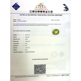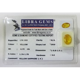 REPORT.NO.-LYA 102CLARITY.-N/ACOLOUR.-YELLOWSHAPE/CUT.-OVALWT.-4.70 CTSDIMENSION.-1-9.8-1.4-3.R.INDEX.-1.76-1.78HARDNESS.-9.0COMMENT.-YELLOW SAPPHIRE { A }..