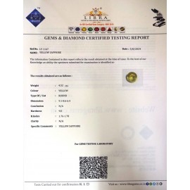 REPORT NO . LY 174CLARITY . N/ACOLOUR . YELLOWSHAPE / CUT . OVALWT . 4.03 CTSDIMENSION . 9-1.7-8.5-7.R . INDEX . 1.76-1.78HARDNESS . 9.0COMMENT . YELLOW SAPPHIRE..