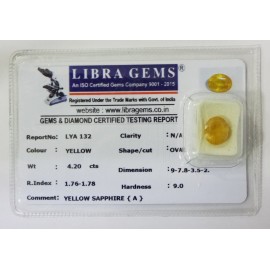 REPORT.NO.-LYA 132CLARITY.-N/ACOLOUR.-YELLOWSHAPE/CUT.-OVALWT.-4.20 CTSDIMENSION.-9-7.8-3.5-2.R.INDEX.-1.76-1.78HARDNESS.-9.0COMMENT.-YELLOW SAPPHIRE { A }..