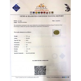 REPORT.NO.-LY 663CLARITY.-N/ACOLOUR.-YELLOWSHAPE/CUT.-OVAWT.-8.57 CTSDIMENSION.-5-1.9-8.5-8.R.INDEX.-1.76-1.78HARDNESS.-9.0COMMENT.-YELLOW SAPPHIRE..