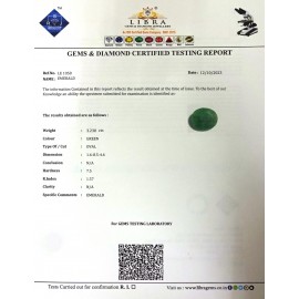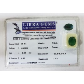 REPORT NO . LE 81CLARITY . N/ACOLOUR . GREENSHAPE / CUT . OVALWT . 3.04 CTSDIMENSION . 10-6.8-5.5-3.R . INDEX . 1.57HARDNESS . 7.5COMMENT . EMERALD..