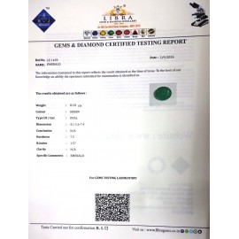 DATE:3-9-2024REF.NO:LE 1439NAME:EMERALDWEIGHT:8.18 CTSCOLOUR:GREENTYPE OF/CUT:OVALDIMENSION:4.1-1.6-7.4CONCLUSION:N/AHARDNESS:7.5R.INDEX:1.57CLARITY:N/ASPECIFIC COMMENTS:EMERALD..