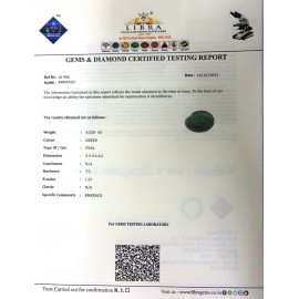 REPORT.NO.-LE 741CLARITY.-N/ACOLOUR.-GREENSHAPE/CUT.-OVALWT.-3.41 CTSDIMENSION.-2-1.8-9.4-3.R.INDEX.-1.57HARDNESS.-7.5COMMENT.-EMERALD..