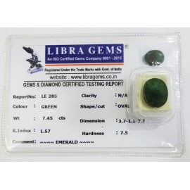 REPORT.NO.-LE 285CLARITY.-N/ACOLOUR.-GREENSHAPE/CUT.-OVALWT.-7.45 CTSDIMENSION.-3-7.1-1.7-7.R.INDEX.-1.57HARDNESS.-7.5COMMENT.-EMERALD..