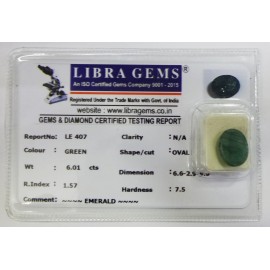 REPORT.NO.LE 407CLARITY.N/ACOLOUR.GREENSHAPE/CUT.OVALWT.6.01 CTSDIMENSION. 6-6.2-9.9-9.R.INDEX.1.57HARDNESS.7.5COMMENT.EMERALD..