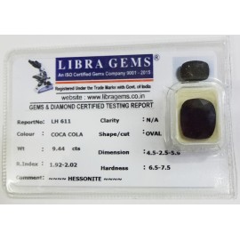 REPORT.NO.-LH 611CLARITY.-N/ACOLOUR.-COCA COLASHAPE/CUT.-OVALWT.-9.44 CTSDIMENSION.-4-5.2-5.5-9.R.INDEX.-1.92-2.02HARDNESS.-6.5-7.5COMMENT.-HESSONITE..