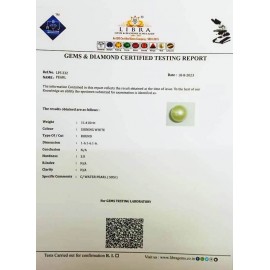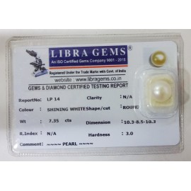 REPORT NO . LP 14CLARITY . N/ACOLOUR . SHINING WHITESHAPE / CUT . ROUNDWT . 7.35 CTSDIMENSION . 10-3.8-5.10-3.R . INDEX . N/AHARDNESS . 3.0COMMENT . PEARL..
