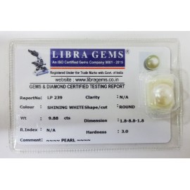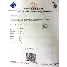 REPORT NO . LP 239CLARITY . N/ACOLOUR . SHINING WHITESHAPE / CUT . ROUNDWT . 9.88 CTSDIMENSION . 1-8.8-8.1-8.R . INDEX . N/AHARDNESS . 3.0COMMENT . PEARL..