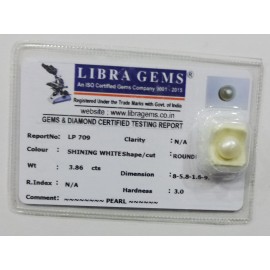 REPORT NO . LP 709CLARITY . N/ACOLOUR .SHINING WHITESHAPE / CUT . ROUNDWT . 3.86 CTSDIMENSION . 8-5.8-1.6-9.R . INDEX . N/AHARDNESS . 3.0COMMENT . PEARL..