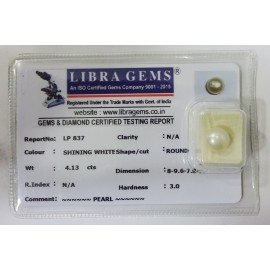 REPORT NO . LP 837CLARITY . N/ACOLOUR . SHINING WHITESHAPE / CUT . ROUNDWT . 4.13 CTSDIMENSION . 8-9.6-7.8-9.R . INDEX . N/AHARDNESS . 3.0COMMENT . PEARL..