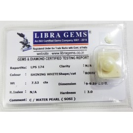 REPORT NO . LPS 174CLARITY . N/ACOLOUR . SHINING WHITESHAPE / CUT . ROUNDWT . 7.53 CTSDIMENSION . 9-9.10-1.9-9.R . INDEX . N/AHARDNESS . 3.0COMMENT . C / WATER PEARL { SOSI }..