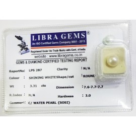 REPORT.NO.-LPS 287CLARITY.-N/ACOLOUR.-SHINING WHITESHAPE/CUT.-ROUNDWT.-3.31 CTSDIMENSION.-7-6.7-7.7-7.R.INDEX.-N/AHARDNESS.-3.0COMMENT.-C / WATER PEARL { SOSI }..