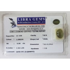 REPORT NO . LC 158CLARITY . N/ACOLOUR . L . GREENSHAPE / CUT . OVALWT . 6.00 CTSDIMENSION . 3-1.1-2.6-1.R . INDEX . 1.54-1.55HARDNESS . 7.5COMMENT . CATS EYE { S . QUARTZ }..