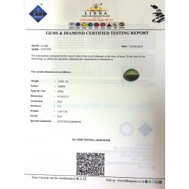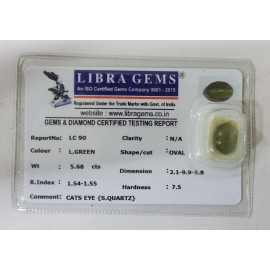 REPORT.NO.-LC 499CLARITY.-N/ACOLOUR.-L . GREENSHAPE/CUT.-OVALWT.-12.05 CTSDIMENSION.-4-5.1-5.9-4.R.INDEX.-1.54-1.55HARDNESS.-7.5COMMENT.- CATS EYE { S . QUARTZ }..
