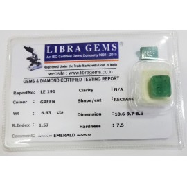 REPORT.NO.-LE 191CLARITY.-N/ACOLOUR.-GREENSHAPE/CUT.-RECTANGLEWT.-6.63 CTSDIMENSION.-10.6-9.7-8.3R.INDEX.-1.57HARDNESS.-7.5COMMENT.-EMERALD..