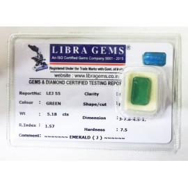 REPORT NO . LEJ 55CLARITY . N/ACOLOUR . GREENSHAPE / CUT . RECTANGLEWT . 5.18 CTSDIMENSION . 3-7.8-4.5-1.R . INDEX . 1.57HARDNESS . 7.5COMMENT . EMERALD { J }..
