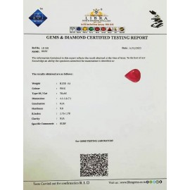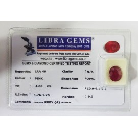 REPORT NO . LRA 46CLARITY . N/ACOLOUR . PINKSHAPE / CUT . OVALWT . 4.86 CTSDIMENSION . 10-9.9-1.5-2.R . INDEX . 1.76-1.78HARDNESS . 9.0COMMENT . RUBY { A }..