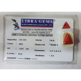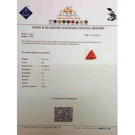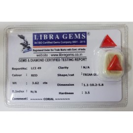 REPORT. NO. LCI 49CLARITY. N/ACOLOUR. REDSHAPE/CUT. TRIANGLEWT. 3.62 CTSDIMENSION. 1.1-10.2-5.8R. INDEX. N/AHARDNESS. 3.5COMMENT. CORAL..