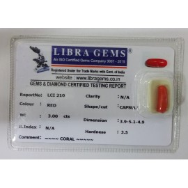REPORT NO . LCI 289CLARITY . N/ACOLOUR . REDSHAPE / CUT . CAPSULEWT . 3.97 CTSDIMENSION . 5-3.5-4.6-1.R . INDEX . N/AHARDNESS . 3.5COMMENT . CORAL..