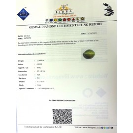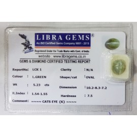 REPORT NO . LCK 1CLARITY . N/ACOLOUR . L . GREENSHAPE / CUT . OVALWT . 5.23 CTSDIMENSION . 10-2.8-3.7-2.R . INDEX . 1.54-1.55HARDNESS . 7.5COMMENT . CATS EYE { K }..