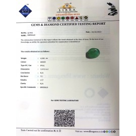 REPORT NO . LE 12CLARITY . N/ACOLOUR . GREENSHAPE / CUT . OVALWT . 3.90 CTSDIMENSION . 1-9.8-8.5-7.R . INDEX . 1.57HARDNESS . 7.5COMMENT . EMERALD..