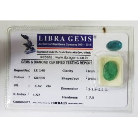 REPORT NO . LE 140CLARITY . N/ACOLOUR . GREENSHAPE / CUT . OVALWT . 4.87 CTSDIMENSION . 3-1.9-4.5-2.R . INDEX . 1.57HARDNESS . 7.5COMMENT . EMERALD ..