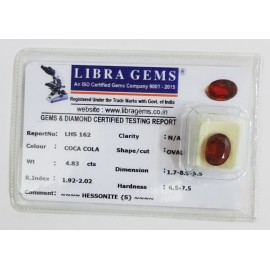 REPORT.NO.-LHS 162CLARITY.-N/ACOLOUR.-COCA COLASHAPE/CUT.-OVALWT.-4.83 CTSDIMENSION.-1-7.8-9.5-5.R.INDEX.-1.92-2.02HARDNESS.-6.5-7.5COMMENT.-HESSONITE { S }..
