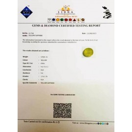 REPORT NO . LY 266CLARITY . N/ACOLOUR . YELLOWSHAPE / CUT . OVALWT . 5.2 CTSDIMENSION . 2-2.9-2.4-3.R . INDEX . 1.76-1.78HARDNESS . 9.0COMMENT . YELLOW SAPPHIRE..