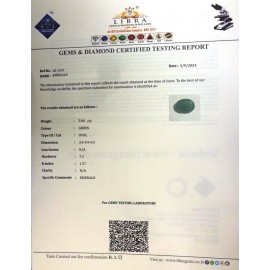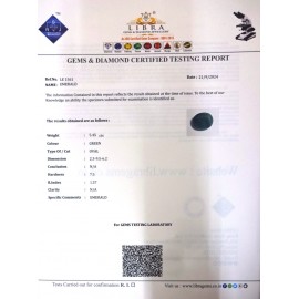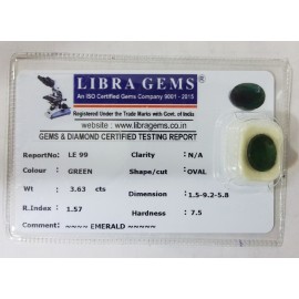 REPORT NO . LE 99CLARITY . N/ACOLOUR . GREENSHAPE / CUT . OVALWT . 3.63 CTSDIMENSION . 1-5.9-2.5-8.R . INDEX . 1.57HARDNESS . 7.5COMMENT . EMERALD..