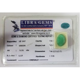 REPORT NO . LE 147CLARITY . N/ACOLOUR . GREENSHAPE / CUT . OVALWT . 5.31 CTSDIMENSION . 4-1.9-8.5-5.R . INDEX . 1.57HARDNESS . 7.5COMMENT . EMERALD ..