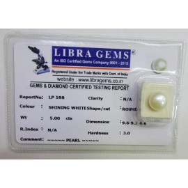 REPORT NO . LP 598CLARITY . N/ACOLOUR . SHINING WHITESHAPE / CUT . ROUNDWT . 5.00 CTSDIMENSION . 9-6.9-7.6-6.R . INDEX . N/AHARDNESS . 3.0COMMENT . PEARL..