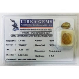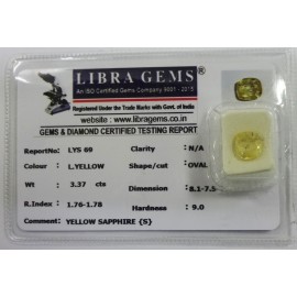 REPORT.NO.- LYS 69CLARITY.-N/A COLOUR.-L.YELLOW SHAPE/CUT.-OVAL WT.-3.37 CTS DIMENSION.- 8.1-7.5-4.9R.INDEX.-1.76-1.78HARDNESS.-9.0COMMENT.-YELLOW SAPPHIRE {S}..