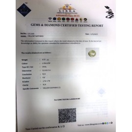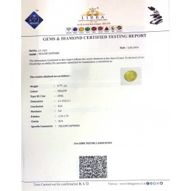 REPORT NO . LY 290CLARITY . N/ACOLOUR . YELLOWSHAPE / CUT . OVALWT . 3.37 CTSDIMENSION . 8-8.7-6.5-1.R . INDEX . 1.76-1.78HARDNESS . 9.0COMMENT . YELLOW SAPPHIRE..