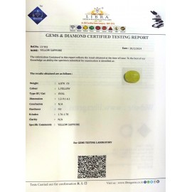 REPORT NO . LY 70CLARITY . N/ACOLOUR . YELLOWSHAPE / CUT . OVALWT . 4.40 CTSDIMENSION . 1-8.10-1.3-5.R . INDEX . 1.76-1.78HARDNESS . 9.0COMMENT . YELLOW SAPPHIRE..