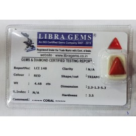 REPORT NO . LCI 148CLARITY . N/ACOLOUR . REDSHAPE / CUT . TRIANGLEWT . 4.48 CTSDIMENSION . 2-3.1-3.5-3.R . INDEX . N/AHARDNESS . 3.5COMMENT . CORAL..