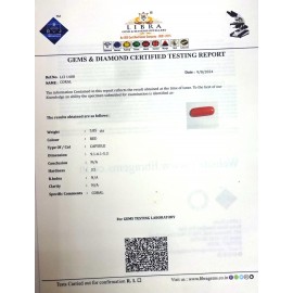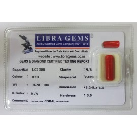 REPORT NO . LCI 308CLARITY . N/ACOLOUR . REDSHAPE / CUT . CAPSULEWT . 4.78 CTSDIMENSION . 5-2.5-3.6-9.R . INDEX . N/AHARDNESS . 3.5COMMENT . CORAL..