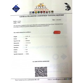 REPORT.NO.LCI 739CLARITY.N/ACOLOUR.REDSHAPE/CUT.CAPSULE WT.5.17 CTSDIMENSION.7.7-6.2-5.1R.INDEX.N/AHARDNESS.3.5COMMENT.CORAL..