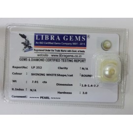 REPORT NO . LP 252CLARITY . N/ACOLOUR . SHINING WHITESHAPE / CUT . ROUNDWT . 7.91 CTSDIMENSION . 1-8.1-4.7-7.R . INDEX . N/AHARDNESS . 3.0COMMENT . PEARL..