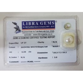 REPORT NO . LP 27CLARITY . N/ACOLOUR . SHINING WHITESHAPE / CUT . ROUNDWT . 6.08 CTSDIMENSION . 10-2.7-1.10-2.R . INDEX . N/AHARDNESS . 3.0COMMENT . PEARL..