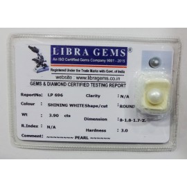REPORT NO . LP 696CLARITY . N/ACOLOUR . SHINING WHITESHAPE / CUT . ROUNDWT . 3.90 CTSDIMENSION . 8-1.8-1.7-2.R . INDEX . N/AHARDNESS . 3.0COMMENT . PEARL..