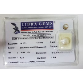 REPORT NO . LP 851CLARITY . N/ACOLOUR . SHINING WHITESHAPE / CUT . ROUNDWT . 4.69 CTSDIMENSION . 9-2.6-9.9-2.R . INDEX . N/AHARDNESS . 3.0COMMENT . PEARL..