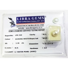 REPORT.NO.-LPS 320CLARITY.-N/ACOLOUR.-SHINING WHITESHAPE/CUT.-ROUNDWT.-3.38 CTSDIMENSION.-7-7.7-8.7-8.R.INDEX.-N/AHARDNESS.-3.0COMMENT.-C / WATER PEARL { SOSI }..
