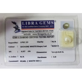 REPORT NO . LPSC 53CLARITY . N/ACOLOUR . SHINING WHITESHAPE / CUT . ROUNDWT . 4.97 CTSDIMENSION . 8-4.8-8.9-6.R . INDEX . N/AHARDNESS . 3.0COMMENT . PEARL { SOUTH SEA }..