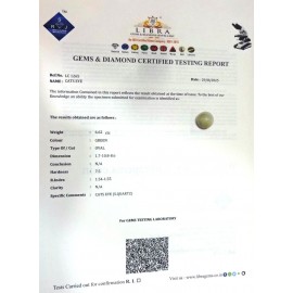 REPORT NO . LC 103CLARITY . N/ACOLOUR . L . GREENSHAPE / CUT . OVALWT . 6.20 CTSDIMENSION . 10-8.1-4.7-5.R . INDEX . 1.54-1.55HARDNESS . 7.5COMMENT . CATS EYE { S . QUARTZ }..