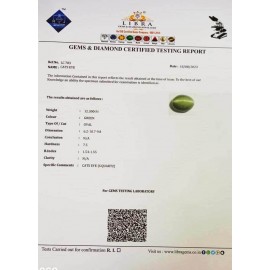 REPORT.NO.-LC 520CLARITY.-N/ACOLOUR.-L . GREENSHAPE/CUT.-OVALWT.-7.74 CTSDIMENSION.-2-8.10-2.8-1.R.INDEX.-1.54-1.55HARDNESS.-7.5COMMENT.-CATS EYE { S . QUARTZ }..