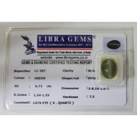 REPORT NO . LC 287CLARITY . N/ACOLOUR . GREENSHAPE / CUT . OVALWT . 6.73 CTSDIMENSION . 3-8.10-1.6-7.R . INDEX . 1.54-1.55HARDNESS . 7.5COMMENT . CATS EYE { S . QUARTZ }..