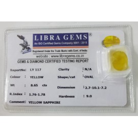 REPORT NO . LY 117CLARITY . N/ACOLOUR . YELLOWSHAPE / CUT . OVALWT . 8.65 CTSDIMENSION . 2-7.10-1.7-2.R . INDEX . 1.76-1.78HARDNESS . 9.0COMMENT . YELLOW SAPPHIRE..