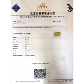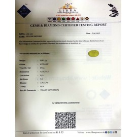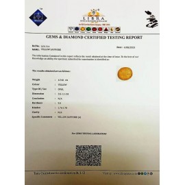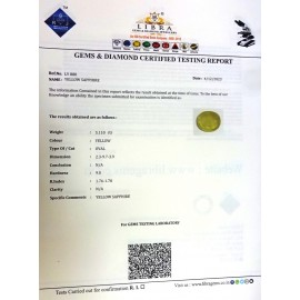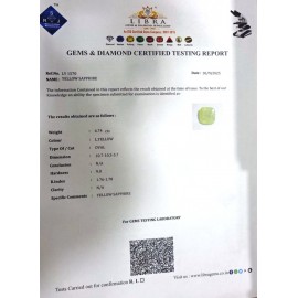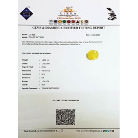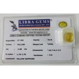 REPORT NO . LY 190CLARITY . N/ACOLOUR . YELLOWSHAPE / CUT . OVALWT . 3.48 CTSDIMENSION . 10-7.8-2.3-4.R . INDEX . 1.76-1.78HARDNESS . 9.0COMMENT . YELLOW SAPPHIRE..